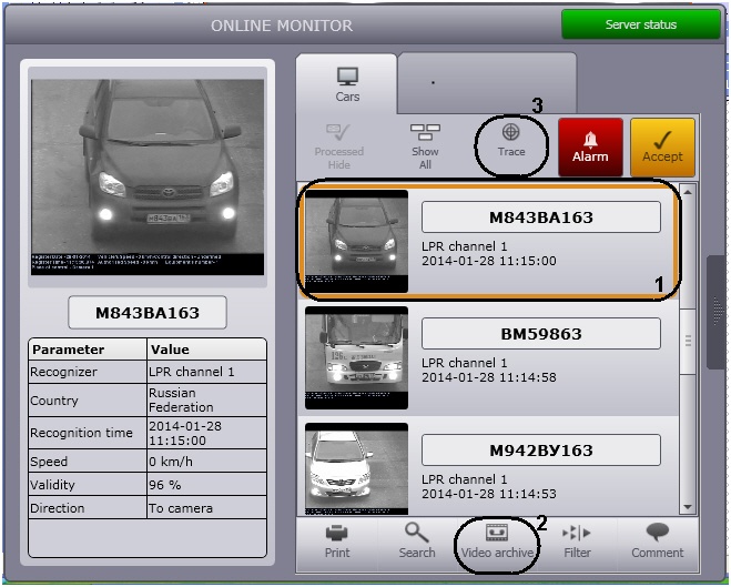 1. Select the event in the identification vehicles protocol or alarms protocol, clicking upon it with a left mouse button (1). Operative update of the protocol, displayed on the screen, will be suspended in result.