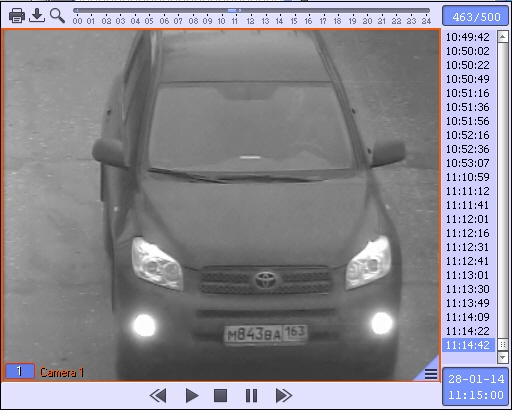 3. In case, when currently the monitor with a video surveillance corresponding to the plates identification camera is displayed on the screen, this video surveillance window will enable the mode of displaying the archive recording by the event. Video archive navigation is described in the document Intellect software package: Operator's Guide. To close the video archive displaying mode it is necessary to click with a left button upon the  sign in the right bottom corner of the video surveillance window.