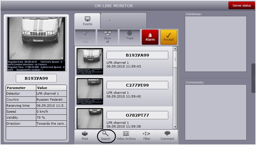Full functionality, provided to operator in the window Searching the events in the recognizer's databases, is the following: