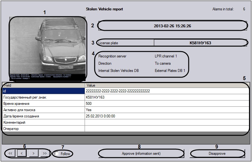 9 | Close the orientation window. The alarm status is not changed when click this button (alarm is not processed). Alarm will disappear from the Alarm window. |