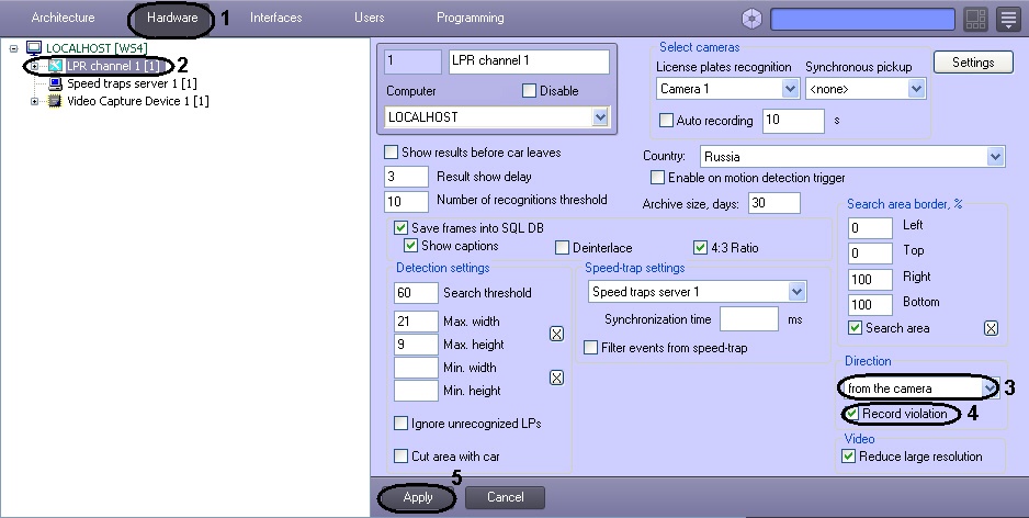 If the from the camera or to the camera value is selected in the Direction dropdown list, the Record violation checkbox become active (4). By default this checkbox is set. That means that in case if the direction of vehicle moving is not coincide with the specified value, the Entering an oncoming lane alarm event will be created. If this event should not be created, uncheck the checkbox.