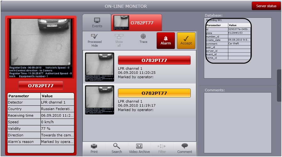 Viewing the alarm protocol is done in a similar way with identified vehicles protocol (see section Viewing the identified vehicles protocol). The difference is that for an alarm there is displayed information about the reason of alarm: