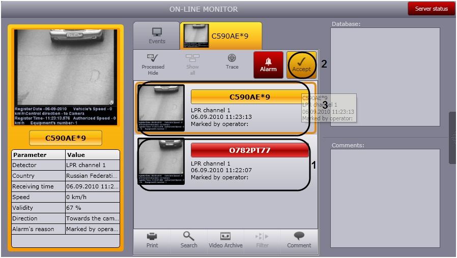 1. Select an alarm in the identified vehicles protocol or in the alarms protocol, clicking it by a left mouse button (1).