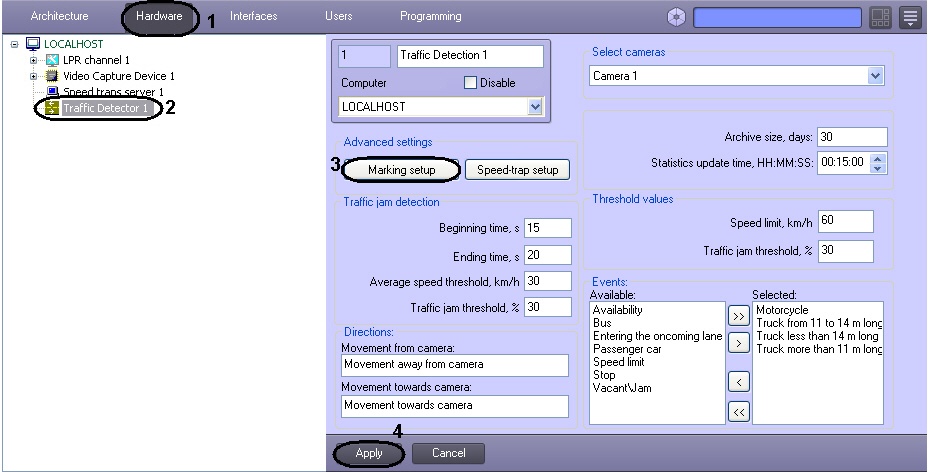 2. In the object tree on the left side of the Hardware tab, select the Traffic Detector object representing the Traffic Detector module to be set up. The settings panel of the selected object will open on the right side of the window (2).