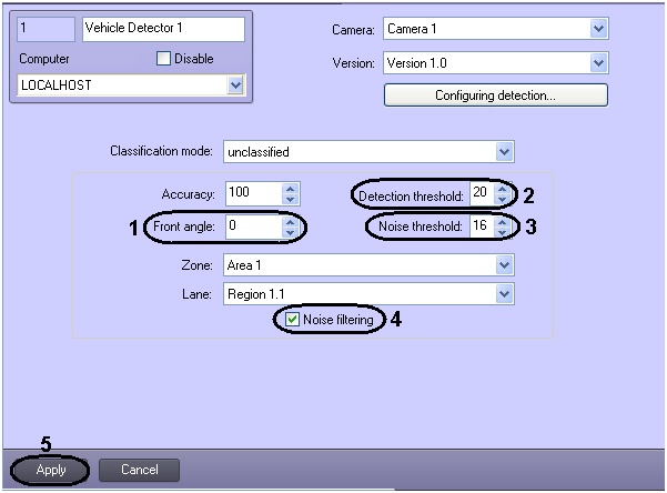 For enabling the vehicle detection algorithm with extremely noisy video signal set the Noise filtering checkbox (4).