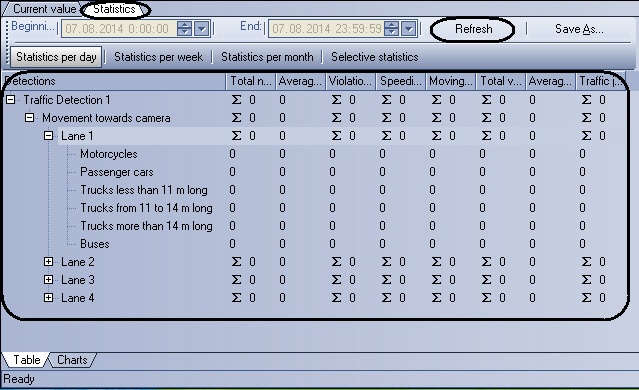 The traffic statistics are displayed in the following tree structure: Recognizer name -> Movement direction -> Lane -> Vehicle type. The statistics data for each level of the tree is shown.