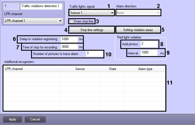 6 | Delay in violation registering field | Setting the value in the field | Set period after which the running a red light or stop will be considered as a violation | Millisecond | 1000 | 0-99999 |