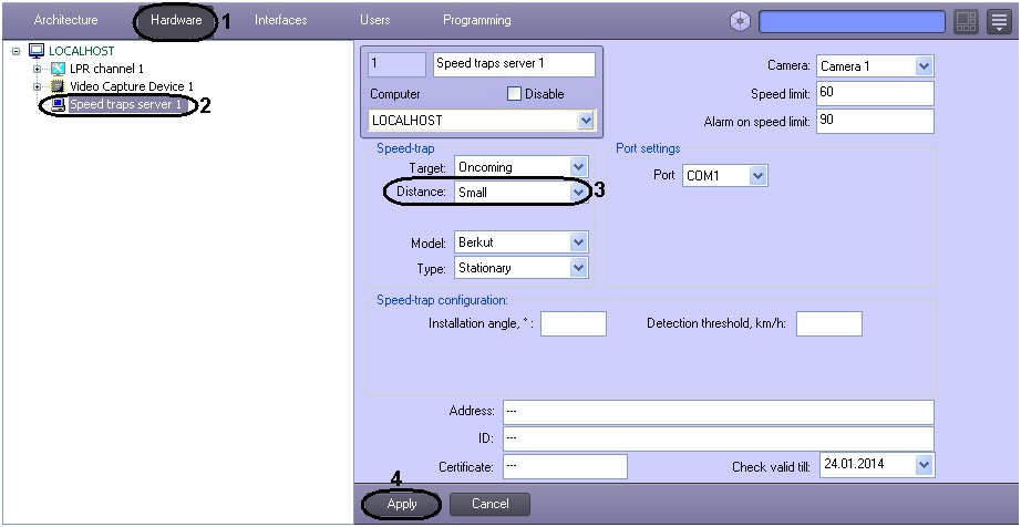 - In the object tree on the left side of the Hardware tab, select the Speed-trap server object representing the Radar module to be set up. The settings panel of the selected object will open on the right side of the window.