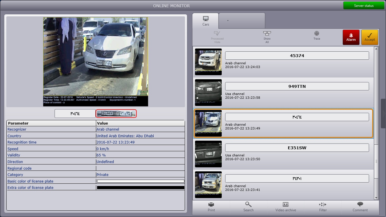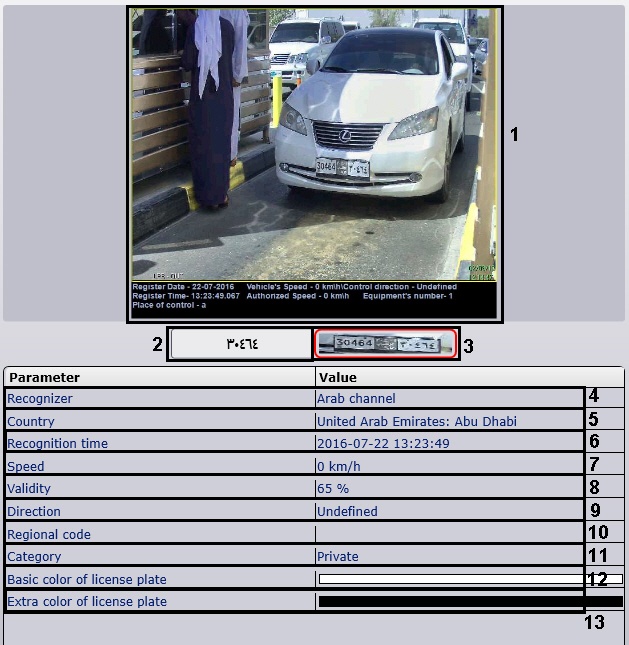 - In the Recognizer field the name of plate's recognizer is displayed (the name of the corresponding object Arab channel) (4).