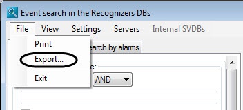 1. In the main menu of the Event search in the Recognizers DBs window, click File → Export.