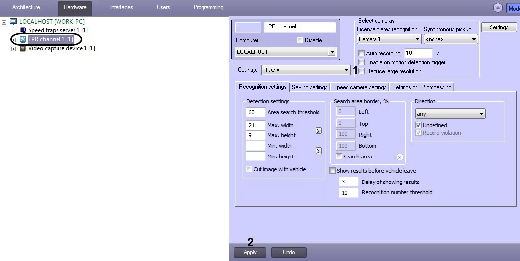 - Go to the LPR channel object settings panel, corresponding to the activated module (see Activating the program module, used for identifying the plates).
