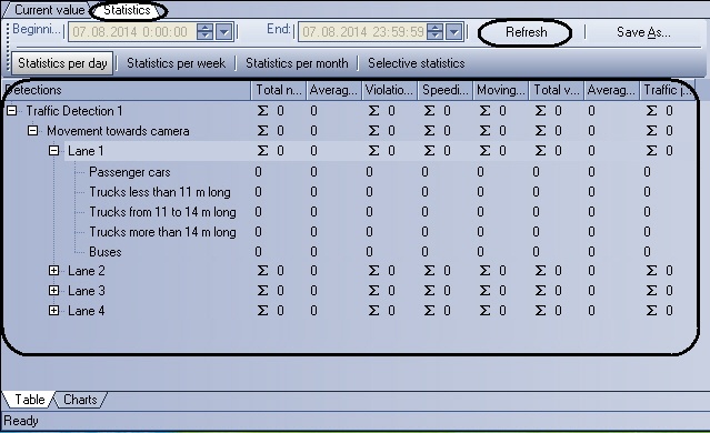 The traffic statistics are displayed in the following tree structure: Recognizer name -> Movement direction -> Lane -> Vehicle type. The statistics data for each level of the tree is shown.