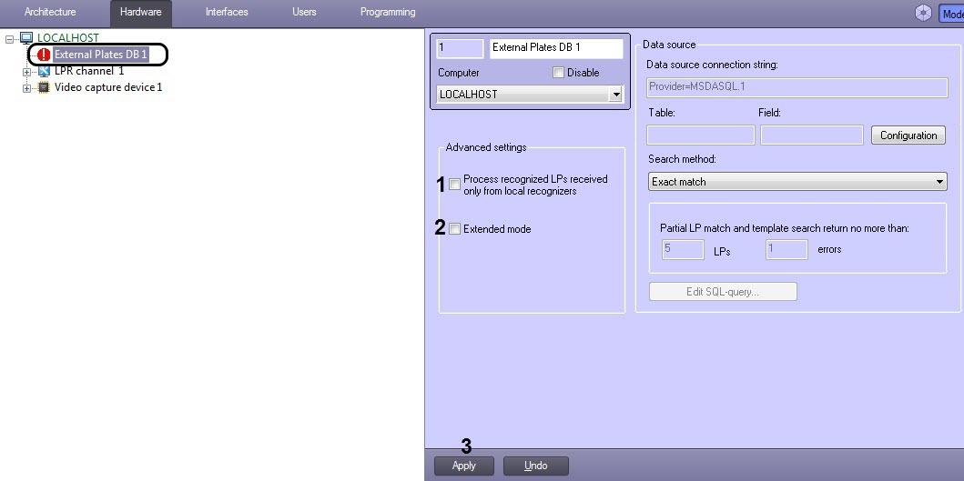 - Set the Process recognized LPs received only from local recognizers checkbox if it is needed to use plates only from local recognizers while compairing with plates stored in the database (3).