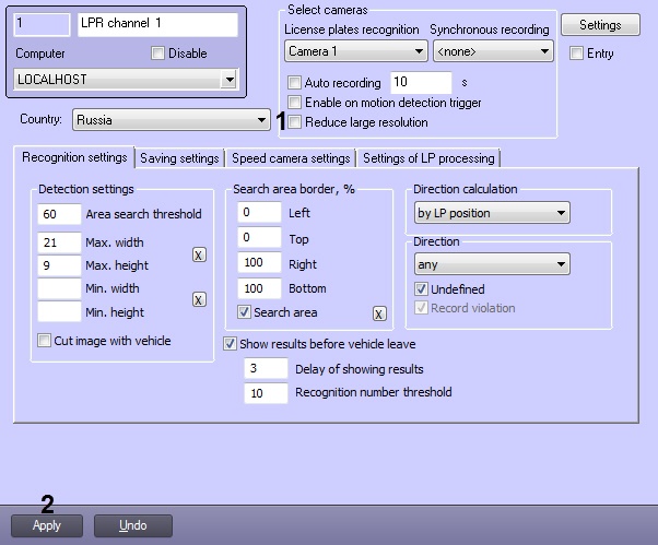 - Go to the LPR channel object settings panel, corresponding to the activated module (see Activating the program module, used for identifying the plates section).