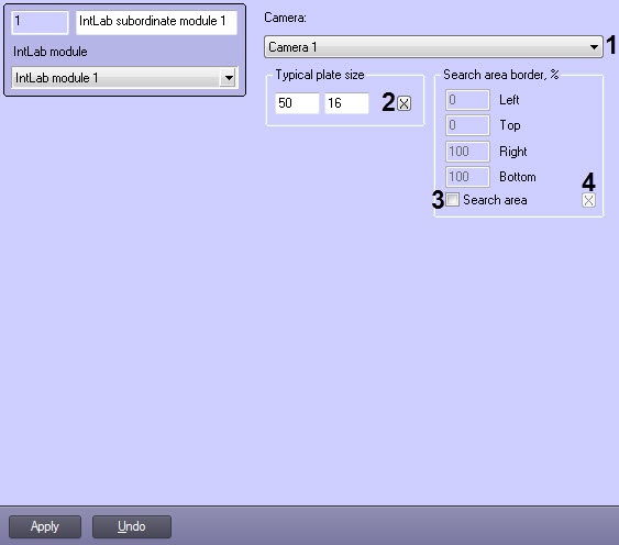 1 | Camera drop-down list | Selecting the value in the list | Selecting Camera object which will perform the recognition of carriage license plates | List of accessible Camera objects | Camera 1 | Depending on number of accessible Camera objects |