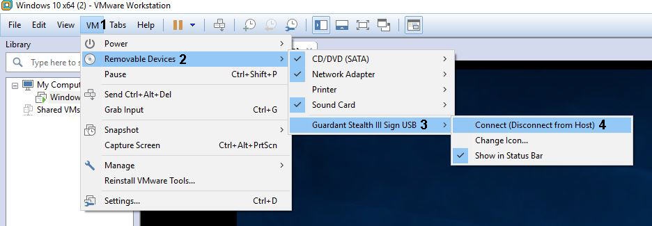 If the USB key is not discovered automatically, then connect it manually: VM (1) → Removable devices (2) → USB (3) → Connect (4).