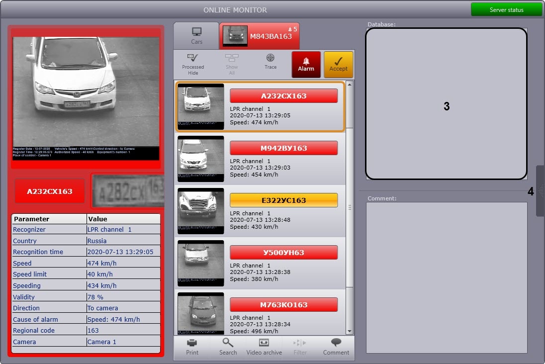 In case the identified vehicle LP is found in the External Plates Database, the information about the vehicle, stored in this base, will be displayed in the field (3).