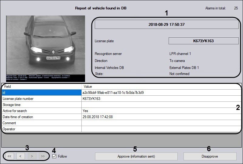 To close the window of stolen vehicle report click the Disapprove button (6). If you click this button, the alarm status will not be changed in the On-line monitor (alarm will not be processed).