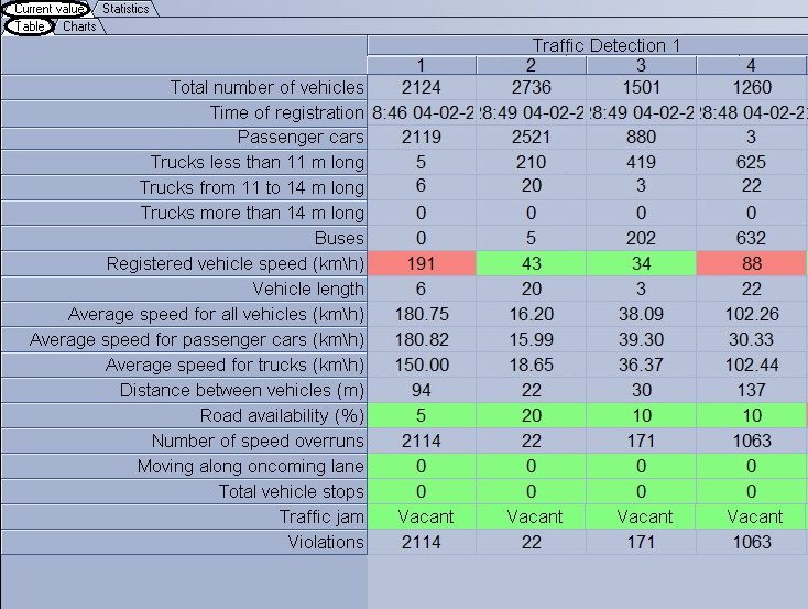 The following figures show the Table sub-tab of the Current value tab displayed by lane and by direction respectively (depending on the system setup).