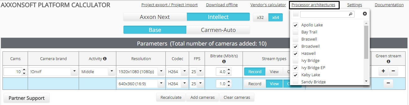 The platform calculator allows taking into account the CPU architecture when choosing the platform and excluding CPUs with improper architecture from the search results. To select the architecture, use the CPU architecture list on the Platform calculator page. Set the checkboxes checked next to those architectures that are to be in the search results.