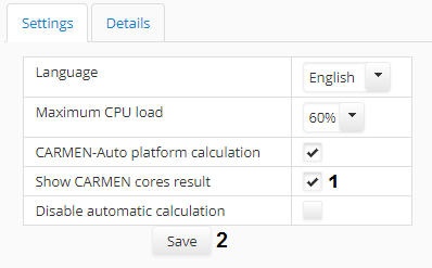 2. In the appeared box set the Show CARMEN cores result (1) checkbox checked and click Save (2).