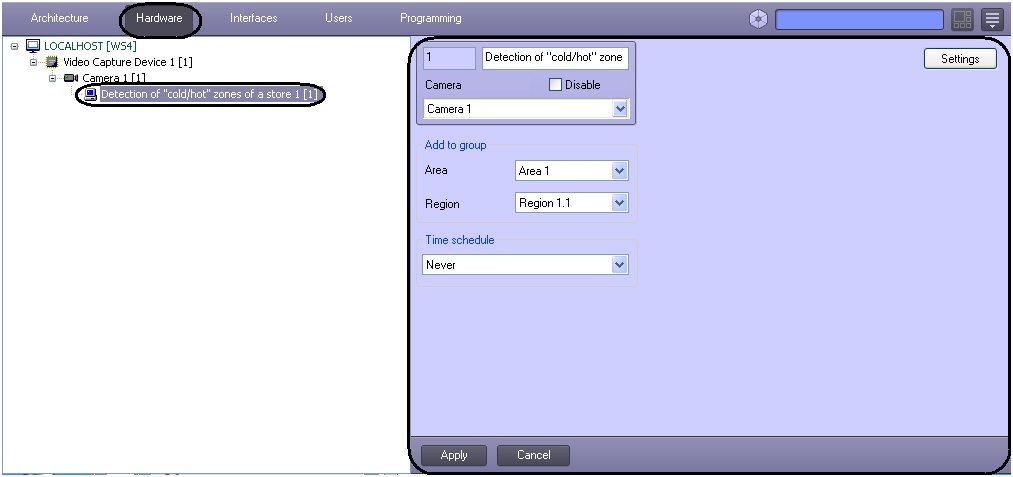 The Heat map detection module can be configured using the System settings menu, under the Hardware tab, on the Heat map detection control panel, using the Camera settings.