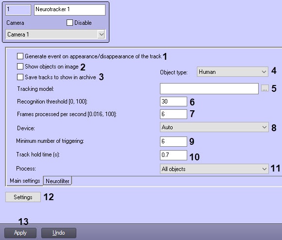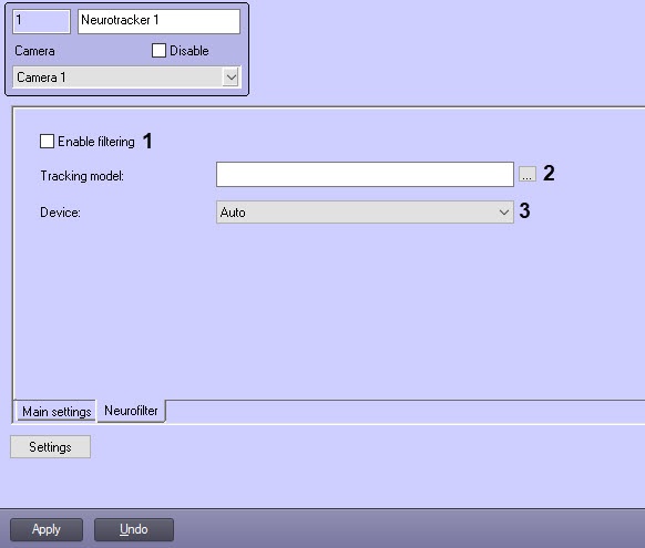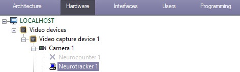 The Neurotracker module is configured on the Neurotracker object settings panel. This object is created on the basis of the Camera object on the Hardware tab of the System settings dialog window.