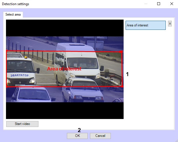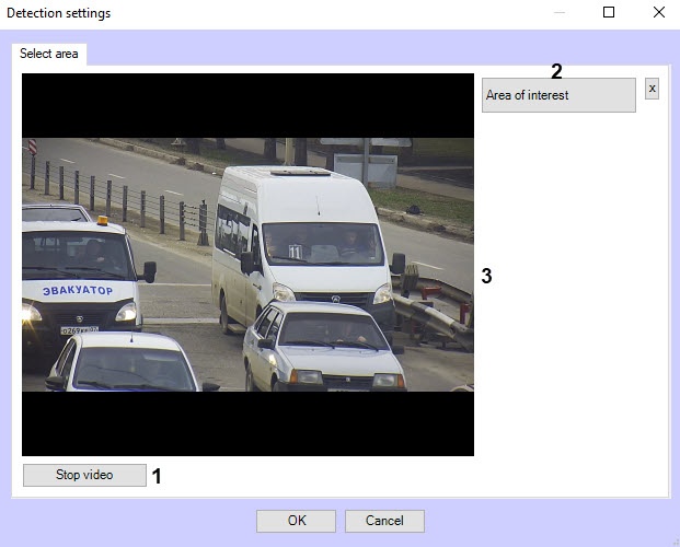 - On the captured video frame (3), set the anchor points of the area, the situation in which you want to analyze (1), by sequentially clicking the left mouse button. Only one area can be added. If you try to add a second area, the first one will be deleted. After adding an area, the rest of the video image will be darkened.