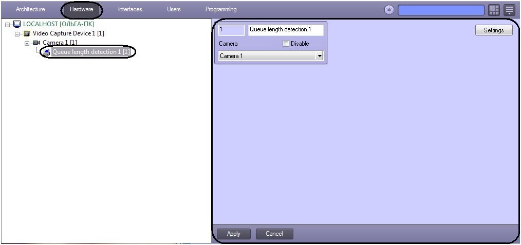 The Queue length detection module can be configured on the settings panel of the Queue length detection object created under the Camera object in the Hardware tab of the System settings dialog box.