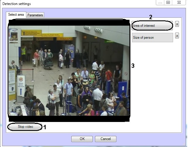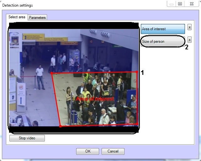 The Detection settings window appears. - Specify the area of interest and the approximate size of a person in the video image:
