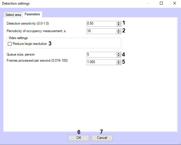 In the Frames processed per second (0.016-100) field, enter the number of frames per second that the detection tool will process (5). The higher the value, the more accurate the detection tool's operation, but the higher the load on the processor.
