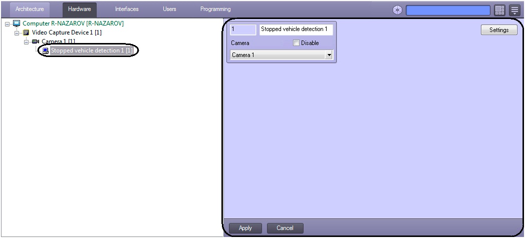 The Stopped vehicle detection module is configured on the settings panel of the Stopped vehicle detection object, created on the basis of the Camera object on the Hardware tab of the System settings dialog window.