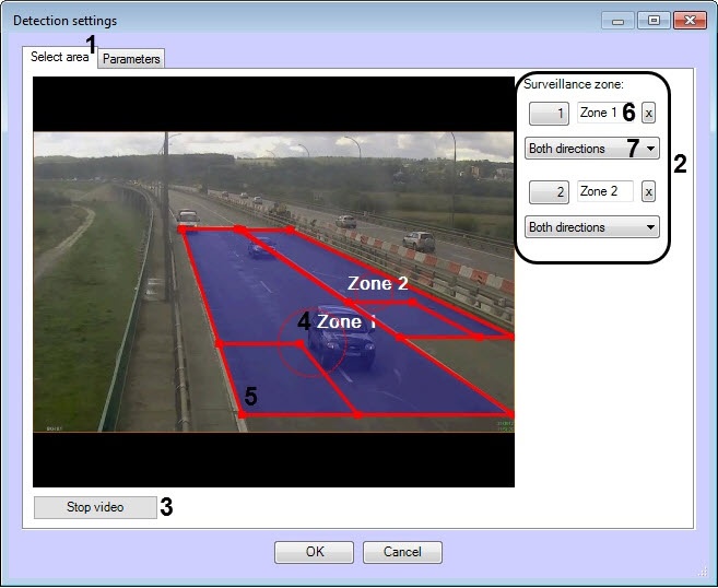 3. Set the surveillance zones on the Select area tab (1). Several zones can be added (2). Detection tool triggering in each zone produces a separate event.