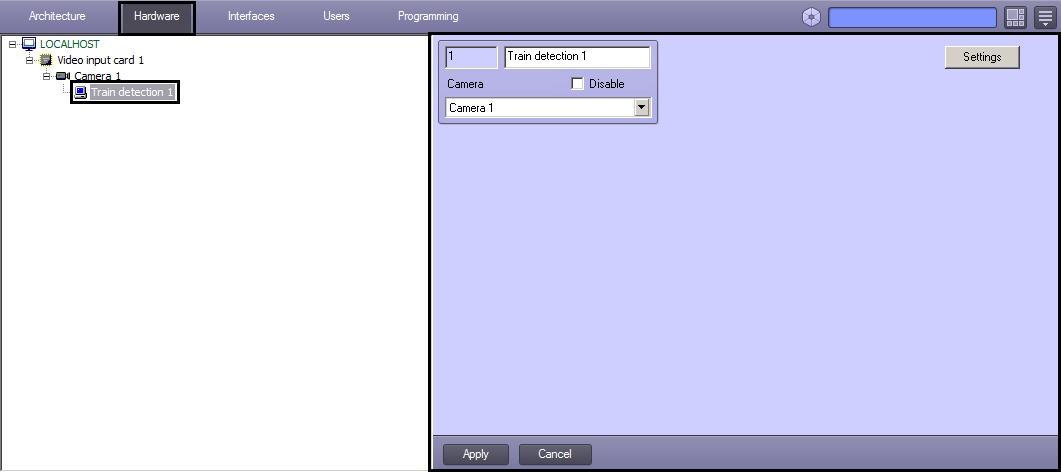The Train detection module can be configured on the settings panel of the Train detection object created on the basis of the Camera object on the Hardware tab of the System settings dialog window.