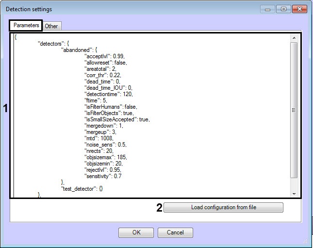 2. On the Parameters tab, the area (1) displays the current detection configuration. This configuration can be copied to any text file. To upload a configuration from a file, click the Load configuration from file button (2).
