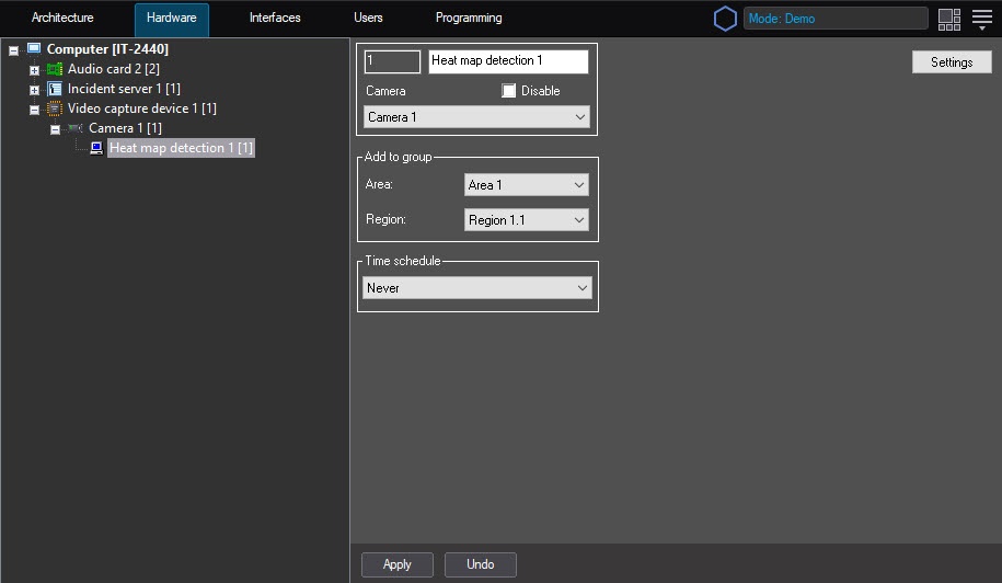 You can configure the Heat map detection module using the settings panel of the Heat map detection object that is created on the basis of the Camera object on the Hardware tab of the System settings window.