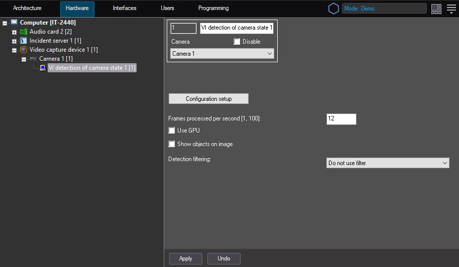 - Go to the settings panel of the VI detection of camera state object that is created on the basis of the Camera object on the Hardware tab of the System settings window.