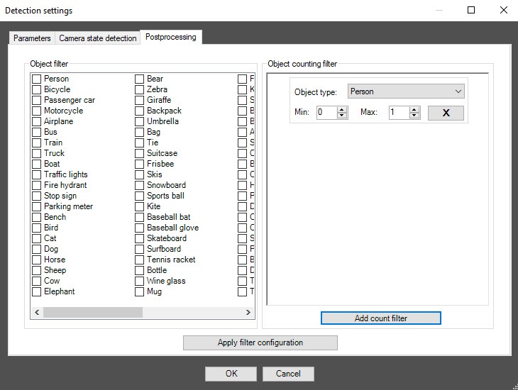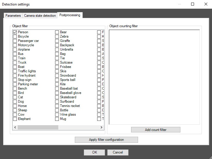 - From the Detection filtering drop-down list, select the filter that you want to use: Object filter, Object counting filter, Do not use filter (default). You can configure filters on the Postprocessing tab of the Detection settings window.