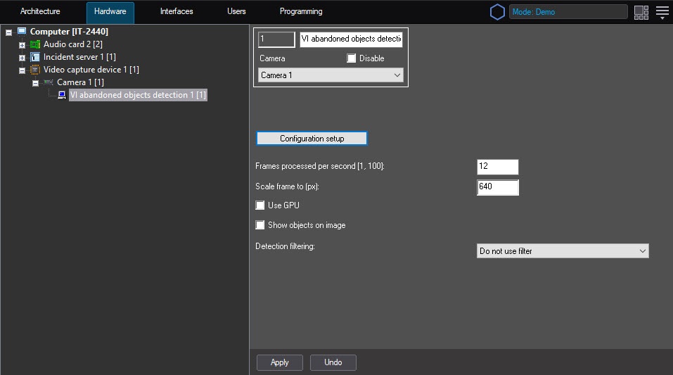 - Go to the settings panel of the VI abandoned objects detection object that is created on the basis of the Camera object on the Hardware tab of the System settings window.