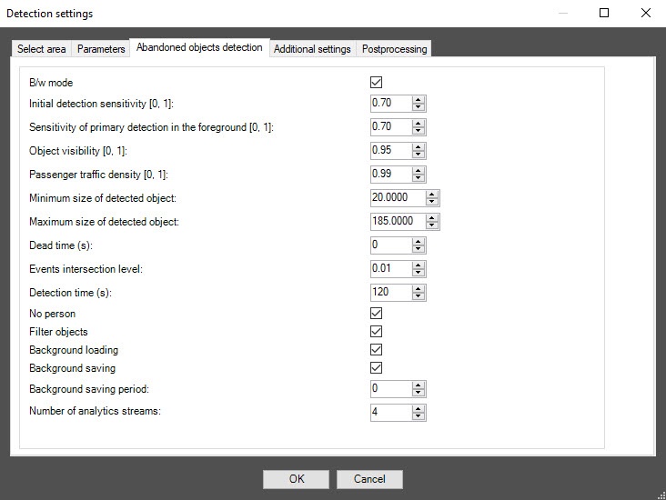 Configuration of the VI abandoned objects detection program module includes general settings and configuration setup: determining the configuration parameters and detector characteristics.