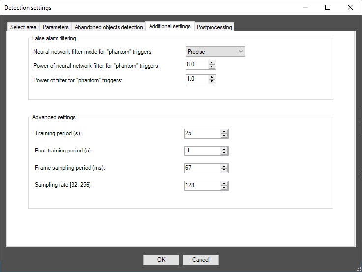 - In the Post-training period (s) field, specify the time in seconds during which the detector "adapts" to the scene. If you disable the parameter, the false triggers can occur during the first minutes of the detector operation due to the algorithm peculiarity. It doesn't affect the quality of the subsequent analysis. There are three modes of configuring the post-training period: