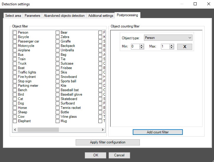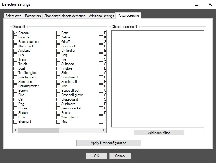 - From the Detection filtering drop-down list, select the filter that you want to use: Object filter, Object counting filter, Do not use filter (default). You can configure filters on the Postprocessing tab of the Detection settings window.
