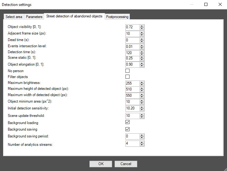 Configuration of the VI abandoned objects street detection module includes general settings and configuration setup: determining the configuration parameters and detector features.
