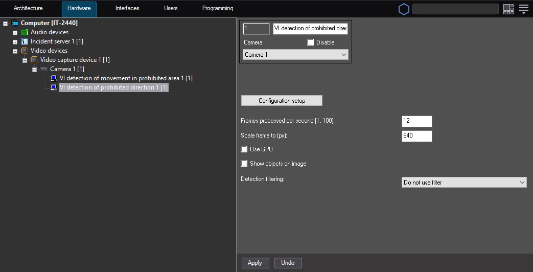 1. Go to the settings panel of the VI detection of prohibited direction object that is created on the basis of the Camera object on the Hardware tab of the System settings window.