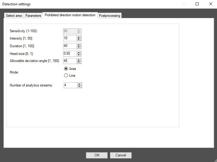 In the Intensity [1, 50] field, specify in arbitrary units in the range 1–50 how noticeable the object's movement in the detection zone must be for the detector to trigger. The default value is 10. If you enter a value out of range, it is automatically changed to the appropriate border value. If you select the Line mode in the Mode parameter, this setting is disabled.