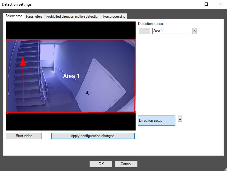 - By default, the detection zone is outlined with a red border. You can change the borders of the detection zone using the mouse by clicking its number in the list on the right, the number of the selected zone is highlighted in blue. Move the borders of the detection zone.