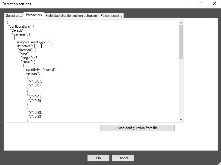 Configuration of the VI detection of prohibited direction module includes general settings and configuration settings: detection zone, configuration parameters, and detector characteristics.