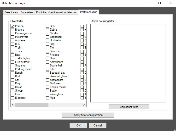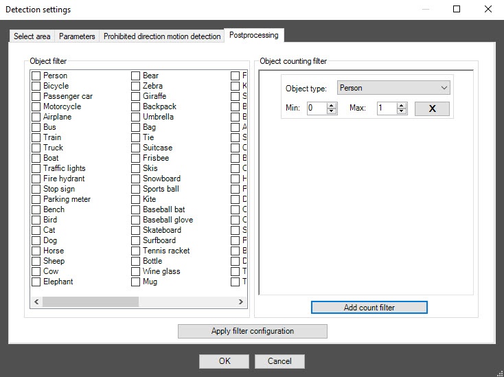 6. From the Detection filtering drop-down list, select the filter that you want to use: Object filter, Object counting filter, Do not use filter (default). You can configure filters on the Postprocessing tab of the Detection settings window.