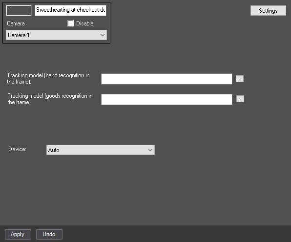 button to the right of the Tracking model (Hand recognition in the frame) and Tracking model (Goods recognition in the frame) fields, and in the standard Windows Explorer window that opens, specify the file of the corresponding neural network. - From the Device drop-down list, select the device on which the neural network will operate: CPU, one of the NVIDIA GPUs, or one of the Intel GPUs. Auto (default)—the device is selected automatically: The NVIDIA GPU gets the highest priority, followed by the Intel GPU, then the CPU.