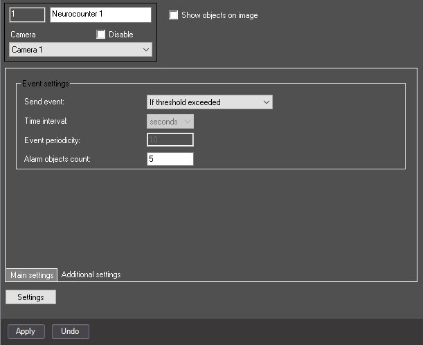 - If threshold exceeded is generated if the number of detected objects in the image is greater than the value specified in the Alarm objects count field;